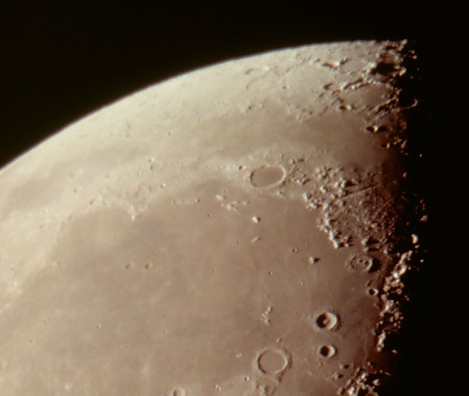 Montes Alpes (Alpen, Mitte rechts), Mare Frigoris (Meer der Kälte, oben), Mare Imbrium (Regenmeer, unten), Sinus Iridium (Regenbogenbucht, Mitte links)