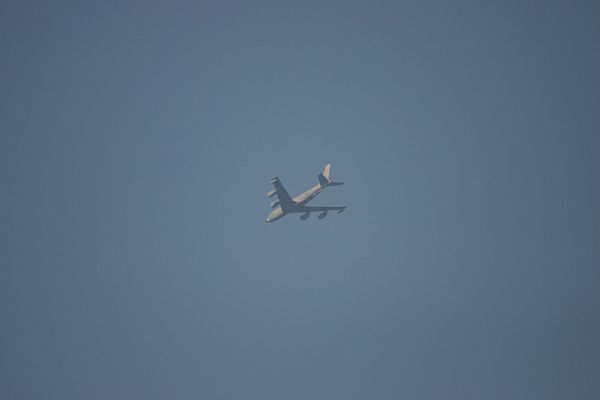 Allerdings sieht man auch hier, daß die weiße Farbe des Kondensstreifens hinter dem Flugzeug deutlich intensiver wird als direkt am Triebwerk. Diese British Airways Boeing 747 hinterließ einen etwas stabileren Kondensstreifen, aber keinen fetten "Chemtrail". Die Flughöhe hebe ich nach der weiter unten vorgestellten Methode zu 12,4 +/- 0,3 km berechnet.