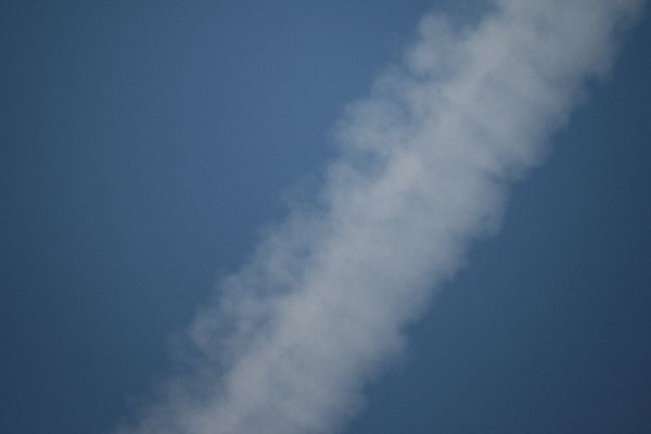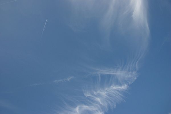 Das folgende Foto ist wohl eines der ungewöhnlichsten, das ich je aufgenommen habe - ein absoluter Einzelfall. Für Chemtrails-Theoretiker ist klar, daß hier ein "Chemtrail" versprüht und plötzlich beendet wurde. Das Foto ist in der Tat interessant, es ist zu vermuten, daß auch hier sich die Luftfeuchtigkeit spontan geändert hat (wie bei Wolke - Wolkenlücke - Wolke) und nur der Kernbereich der Kondensstreifen bestehen blieb. Selbst wenn es ein "Chemtrail" wäre - das Foto ist ein Einzelfall! Woher kommen die anderen "Chemtrails"?