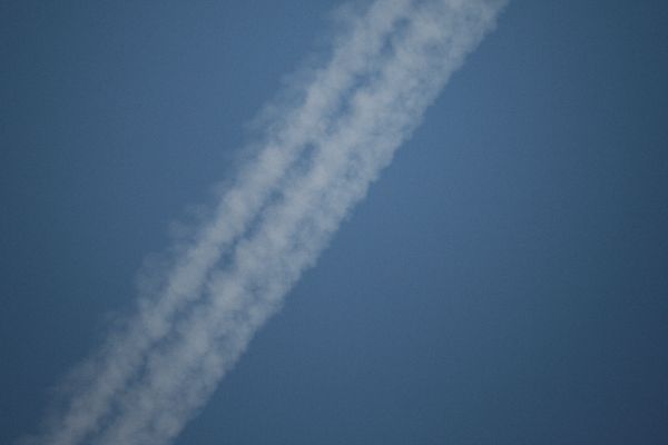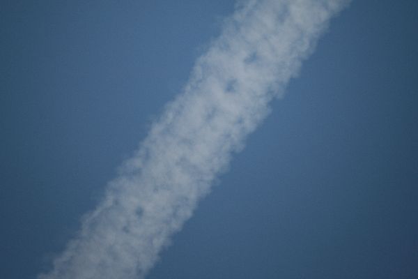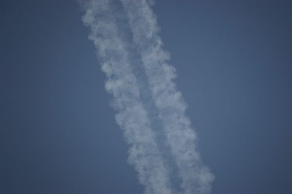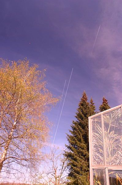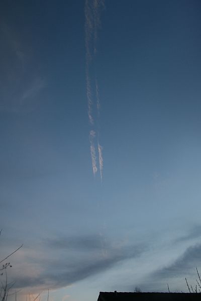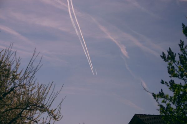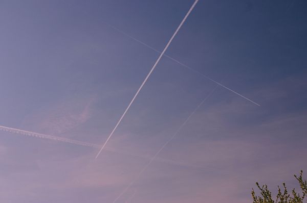 Auf diesem Foto sieht man 2 Kondensstreifen zweier Flugzeuge, die im Abstand von einigen Minuten parallel zueinander flogen. Das zweite habe ich selber beobachtet, als es am Kondensstreifen des ersten vorbeiflog. Offenbar flogen sie auf gleicher Höhe bei sehr ähnlichen Luftverhältnissen. Jedenfalls konnte ich beobachten, daß das 2. Flugzeug einen ganz normalen gleichförmigen Kondensstreifen hinterließ, der sich an manchen Stellen schneller, an anderen weniger schnell auflöste!