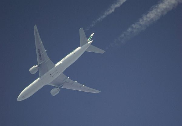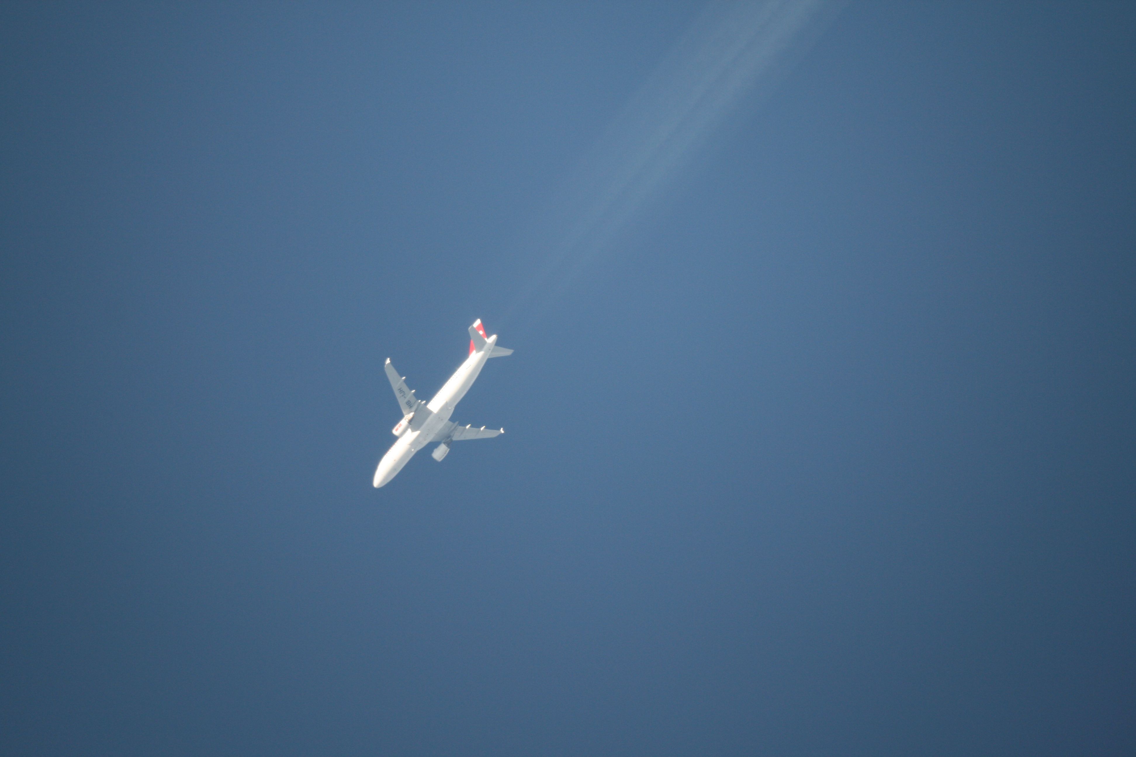 Da das Flugzeug fast senkrecht fliegt ist die wahre Flugzeuglänge fast identisch mit der scheinbaren. Nehmen wir einen maximalen, extrem pessimistischen Fehler von 10% an so ist die reale Länge auf dem Bild 62mm, das sind 0,96° x 62mm / 185mm = 0,32°. Daraus ergibt sich eine Flughöhe von x = Flugzeuglänge / tan Alpha = 63,7m / tan 0,32° = 11,4km. Die reale Flughöhe dürfte recht genau bei 12km liegen. Klicken Sie auf das Bild um die maximale Auflösung zu erreichen! Flöge das Flugzeug mit 6km nur halb so hoch würde ich das in dramatischer Weise erkennen, da es dann fast die ganze Bildbreite ausfüllen würde wie es in etwa auf dieser Aufnahme des nur etwa halb so großen A319 zu sehen ist: