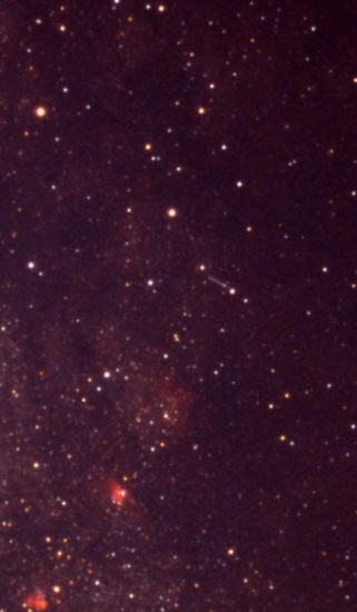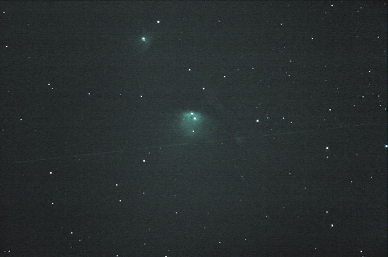 M 78 + Satellit am 10.11.2005, 2:58 MEZ = 1:58 UT, 30s-Aufnahme Da ich ca. einen Monat vorher die gleiche Beobachtung schon mal gemacht hatte und dem Ganzen auf den Grund gehen wollte, beschloß ich, die Montierung anzuhalten. Dabei zeigte es sich, daß sich offenbar ein geostationärer Satellit mit einer sehr geringen Geschwindigkeit langsam nordwärts bewegte. Ich verfolgte ihn mit der Zeit und beobachtete eine scheinbar parabelförmige Bahn. Ich machte 30s-Aufnahmen bei ca. 80-facher Vergrößerung. Ich addierte jedes 5. Bild und gewann folgende Aufnahme: