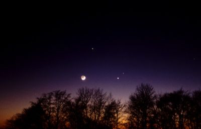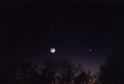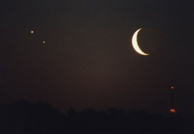 Bei einer schmalen Mondsichel kann man auch stark überbelichten, um den so genannten Erdschein (aschgraues Mondlicht) aufzunehmen. Das ist das Licht, daß die Erde auf den Mond scheint und dieser reflektiert. Bei längeren Belichtungszeiten geht dies nur mit Nachführung! Der Mond mit Erdschein mit einem 25cm-Teleskop und 1300mm Brennweite fotografiert Ebenso totale Mondfinsternis (Blende 5,6 - 200 ASA - 2-4s)!